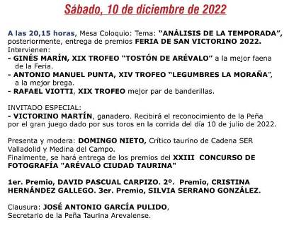 En la jornada del sábado 10 se hará entrega de los premios del XXIII concurso de fotografía «Arévalo Ciudad Taurina» y, par finalizar será el secretario de la Peña, José Antonio García Pulido el que clausure el ciclo.