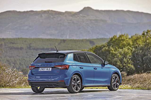 Disponible en blanco, rojo, azul o negro —siempre con techo y pilares en negro—, el Fabia 130 refuerza su identidad con detalles en negro brillante en spoiler, difusor y alerón trasero, además de doble salida de escape visible.