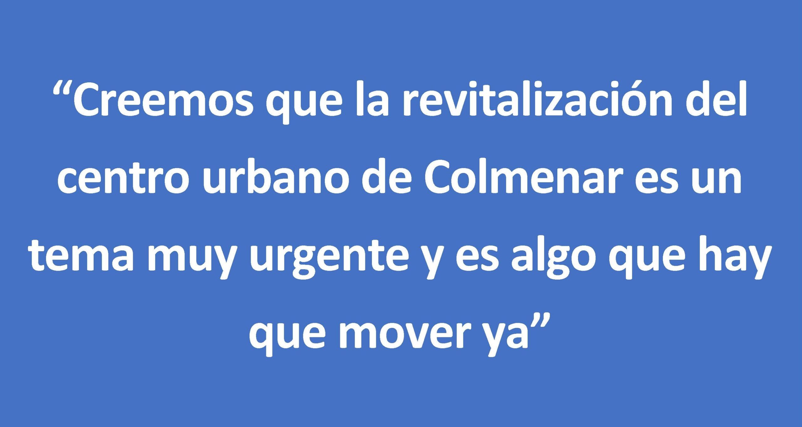 poderlos dar salida en venta o alquiler. Se ha reducido por tanto mucho el comercio local.En ese contexto, creemos que la revitalización del centro urbano es un tema muy urgente y hay que moverlo ya. Y lo podemos hacer con actos culturales, deportivos, fiestas, música en general,… y hacerlo todo el año. Es penoso pasar un domingo por la tarde por el centro del pueblo y que no haya nadie. Hay que ampliar y hacer bien lo de fuera, pero también lo de dentro.Por ello, el centro necesita, lo primero, la línea de transporte de la que hemos hablado y que es prioritaria. El mercado de abastos lleva abandonado un montón de años y hay que buscar fórmulas para que se revitalice, con las asociaciones de artesanos o los fabricantes de productos agroalimentarios de Colmenar, por ejemplo, a los que se les podía ceder un espacio. Hay que mejorar el aparcamiento y, en fin, muchas cosas para facilitar la vida al ciudadano. No todo van a ser grandes superficies, que están muy bien, tenemos que acercar el comercio a los vecinos y fomentar su creación con bonificaciones y, así, crear también economía y empleo.